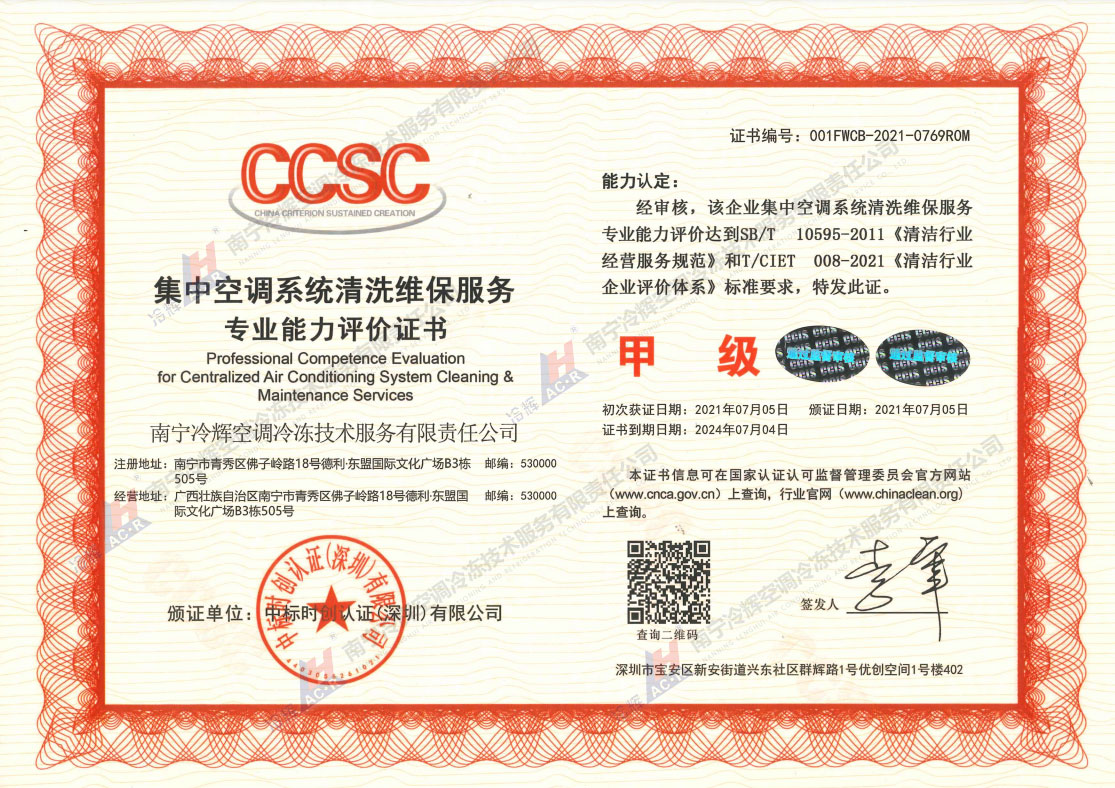 (第二次监审)集中空调系统清洗维保服务专业能力评价证书(甲级)