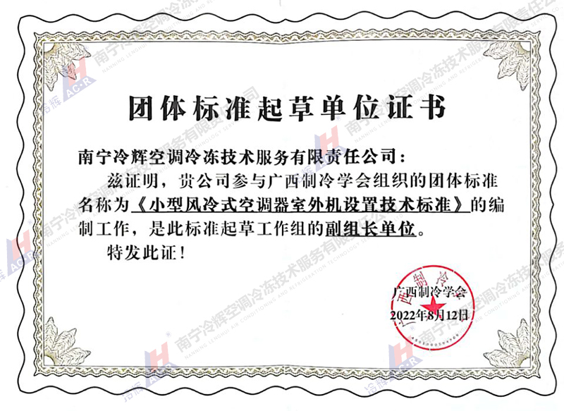 团体标准起草单位证书《小型风冷式空调器室外机设置技术标准》